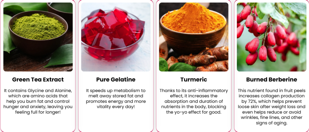 It contains Green Tea Extract that accelerates metabolism and activates thermogenesis, Pure Gelatine that supports your body’s fat-burning process, Turmeric that fights inflammation and helps reduce bloating, and Berberine that regulates blood sugar and controls cravings.